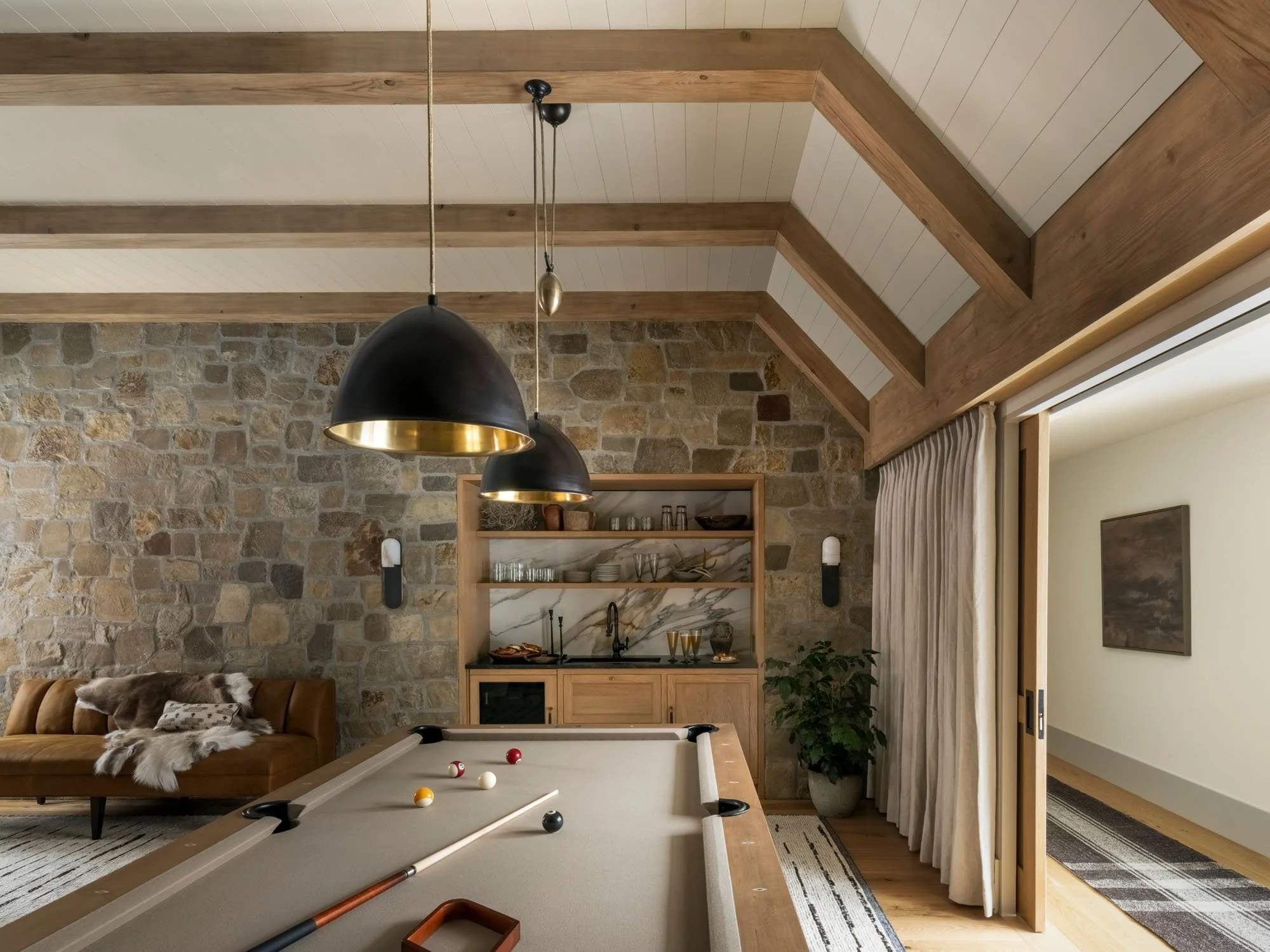 Set just east of the Cascades in Tumble Creek, this home was designed as a true four-seasons retreat that feels both relaxed and deeply intentional. The V-shaped layout creates distinct wings for gathering and guests while shaping a sheltered courtyard that offers privacy and a sense of arrival. Inside, the design leans into warm, natural materials and layered textures that feel refined but never fussy, giving the architecture room to breathe while still feeling deeply livable.
